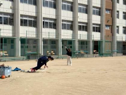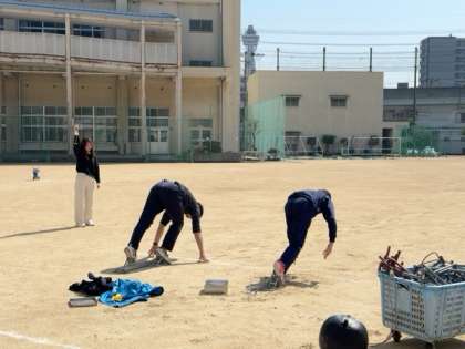 今日(3月22日)から春休みになります。運動場では陸上部がスタートの練習に取り組んでいます。