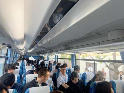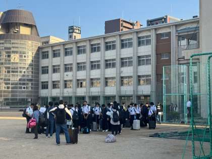 修学旅行一行は、「出発式」ののち、バスに乗って、伊丹空港に向かって出発しました。