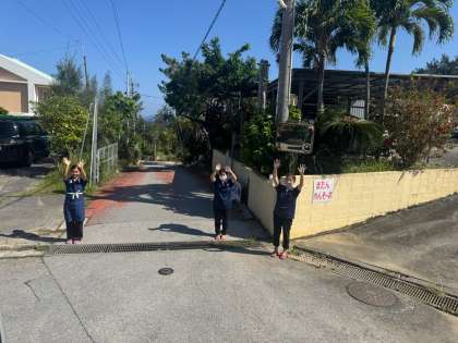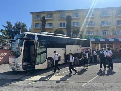 退所式を終えた修学旅行一行は、バスに乗車し、ホテルのみなさんに見送られ、那覇に向かって出発しました。