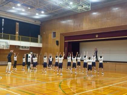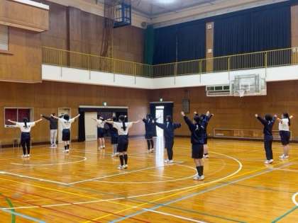男女とも体育館で、ラジオ体操の細かな動きを確認しています。