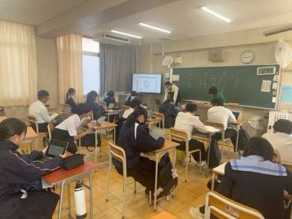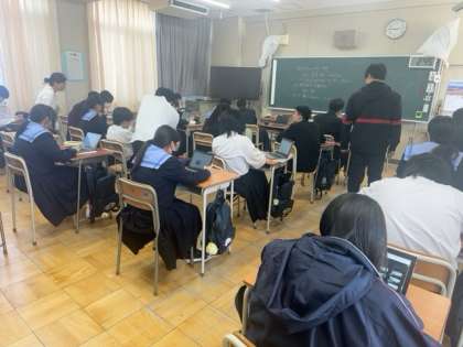 学習者端末を使って、修学旅行の文集作成したり各種アンケートに取り組んだりしています。
