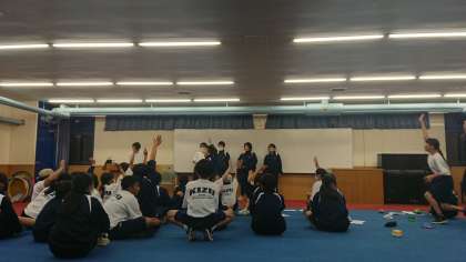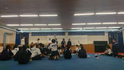 みんなでダンスした後、イントロクイズで盛り上がっています。