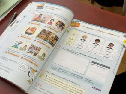 教科書のイラストや写真を見ながら英語のやりとりをしています。