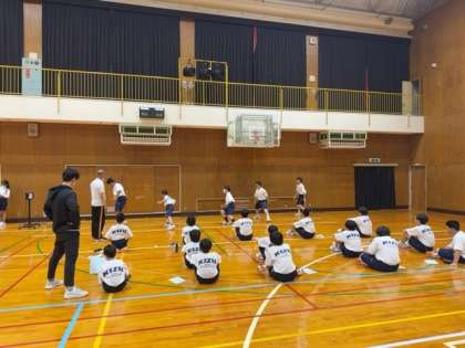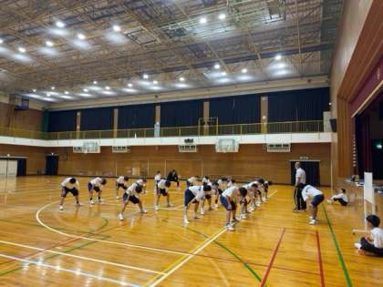 ストレッチをしっかりしたのち、体力テストの反復横跳びの測定に取り組んでいます。