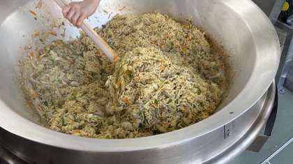 しょうゆベースの味付けの焼きそばで、きざみのりをかけていただきます。