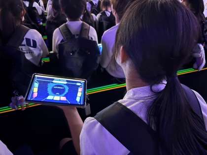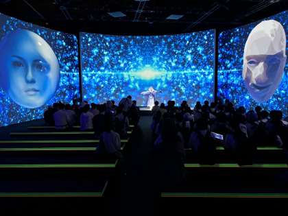 未来の都市パビリオンの中で、参加型シアターを鑑賞しています。