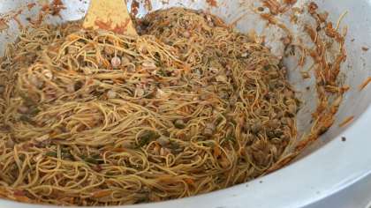 トマトスパゲティですが、しょうゆを使用することで少し和風な仕上がりになっています。