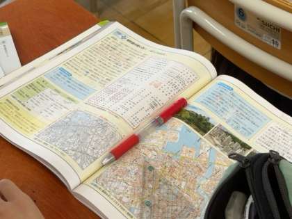 地形図の学習に取り組んでいます。地図記号や縮尺、等高線の読み取りなどがポイントのようです。