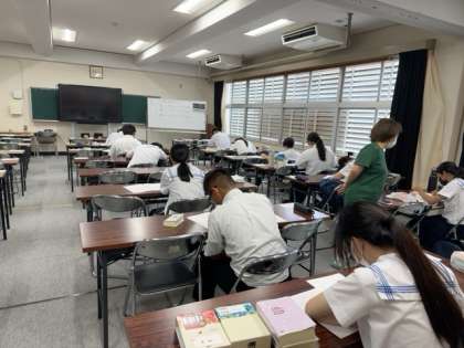 今日も日本語指導を受けている生徒は、別室で、時間延長1.3倍・辞書持込・ルビ打ち問題の配慮を行って、テストに取り組んでいます。