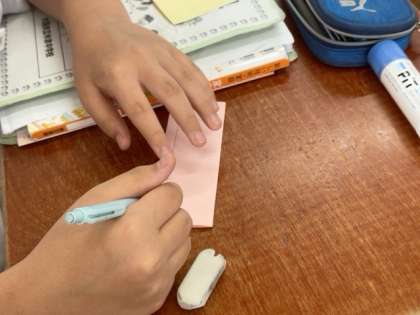 糸の組み合わせを色紙で擬似体験する実習に取り組みます。