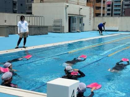 男女とも水泳の授業です。女子は平泳ぎの足の動きを確認しながら練習に取り組んでいます。