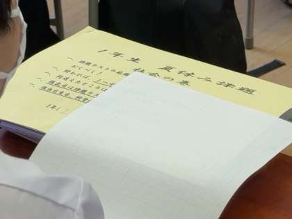 夏休みの課題が配られて、説明を聞いています。