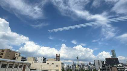 4月13日(日曜日)の開幕日には雨天中止となりましたブルーインパルスですが、本日(7月12日)は、ほぼ予定通りの14時50分頃に、通天閣上空に飛来しました。