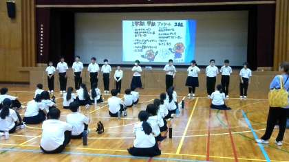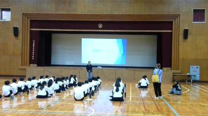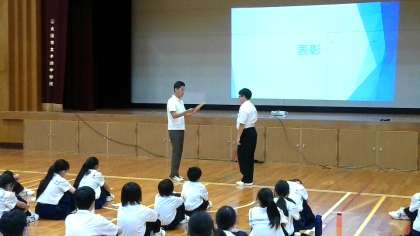 代表生徒からのスピーチや、表彰、そして先生からのお話を聞いています。