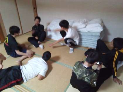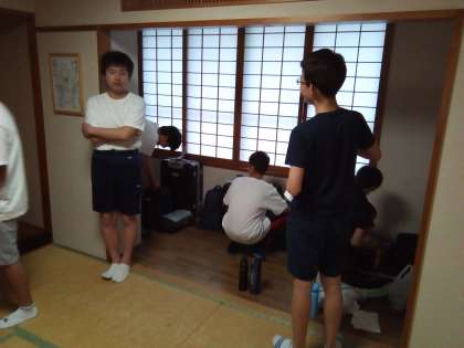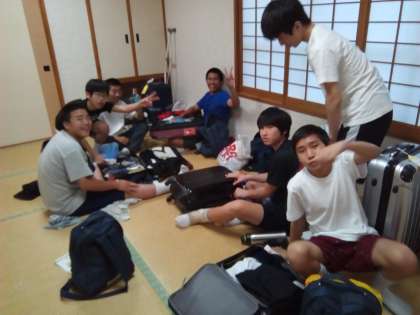 避難経路の確認と破損調査の後は、荷物整理をして部屋着に着替えます。すぐに夕食がはじまりますが、ちょっとリラックス。