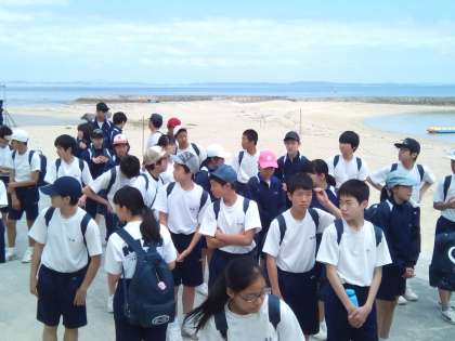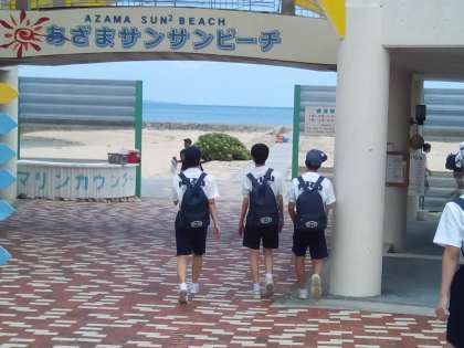 嘉手納から一時間ほどで、あざまさんさんビーチに到着しました。ここで弁当を食べます。そして、シュノーケリング体験やビーチバレー大会を楽しむ予定です。