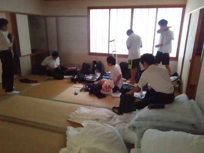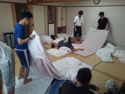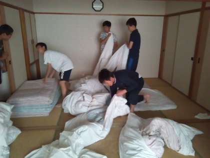 全員が元気に起きて、寝具の片付けや荷物整理を始めています。