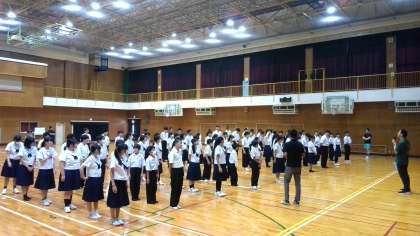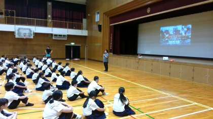 最初に体育館に全校生徒が集まって、校長先生から80年前の今日、広島でおこった「原子爆弾の投下」についてお話を聞きました。