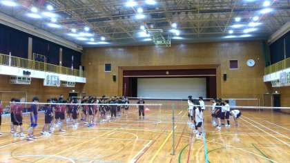 バドミントン部は、住吉区にある大阪市立三稜中学校を招いて、合同練習に取り組みました。相手校の先生から、技術的な指導も受けています。