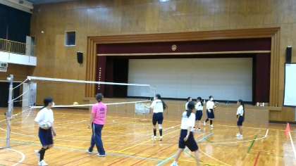 男子はプールで水泳、女子は体育館でバレーボールに取り組んでいます。