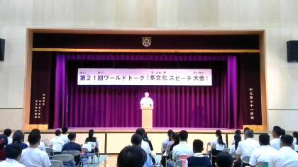 今日(9月6日)の午後、北区にある中之島小中一貫校を会場に、「第21回ワールドトーク(多文化スピーチ大会)」が開かれています。この大会は、普段日本語の勉強をしている中学生が自分の「母語」で自分の意見や考えを発表しあうものです。
