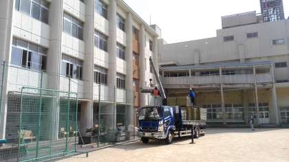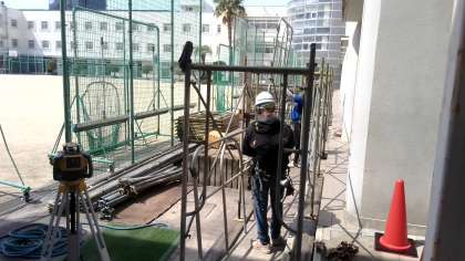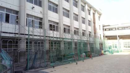 おもに2年生や3年生の教室が入っている校舎(北館)の外壁修繕工事が始まることをけて、校舎に足場を組む工事が始まっています。