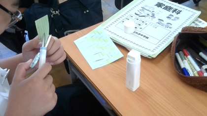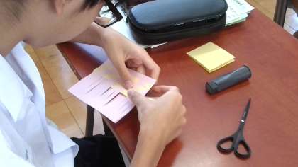 色紙を使って、さまざまな糸の編み込みについて理解を深めています。