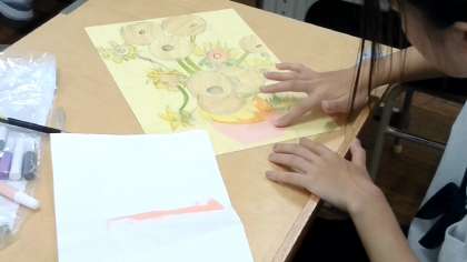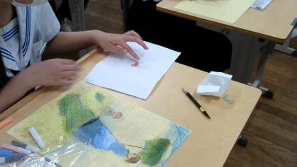 引き続き、教科書に掲載されている絵画の模写に「色砂」で着彩しています。いくつかの「色砂」を混ぜ合わせて新しい色も作っています。力作が期待できそうです!