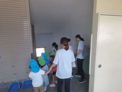 木津中学校の南側に隣接する保育園「すくすくの杜」の園児と先生方が、水害(洪水)発生時に高いところへの避難を必要とするため、本校3階まで避難する訓練のために来校しました。