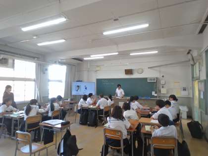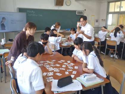 先生が自作した「英語カルタ」ゲームに取り組んでいます。