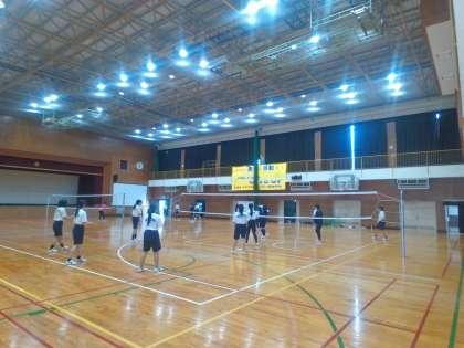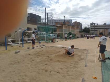 男子は、運動場で「走り幅跳び」、女子は体育館で「バレーボール」に取り組んでいます。