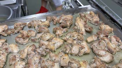 今日は鶏肉のバジル焼きです。鳥のもも肉にバジルの下味をつけてふっくら焼き上げました。