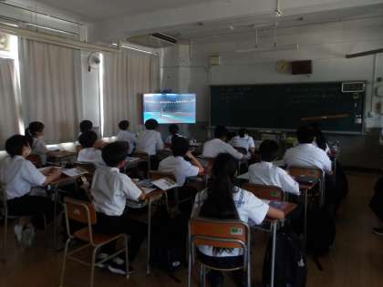 理科の授業です。スポーツの時に働くエネルギーについて動画資料を通して学んでいます。