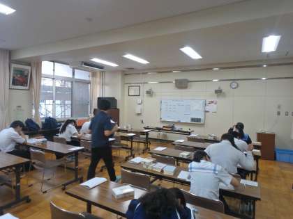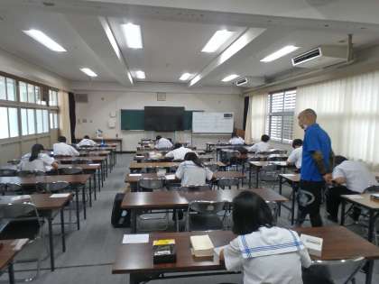日本語指導を受けている生徒は、別室にて、時間延長、辞書持込、ルビうちの配慮を行って、テストに取り組んでいます。