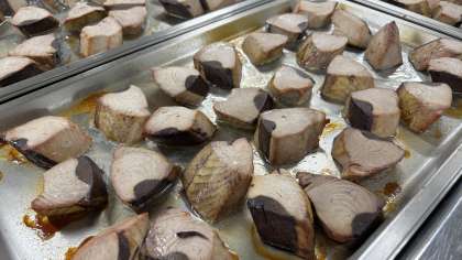 オーブンで焼いた肉厚なかつおにノンエッグドレッシングとにんにくを合わせたソースをかけました。