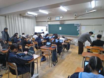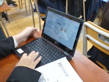来年1月に、2年生では「職場体験学習」に取り組みます。そこで、それぞれの体験先について、学習者用端末を使って調べ学習に取り組んでいます。