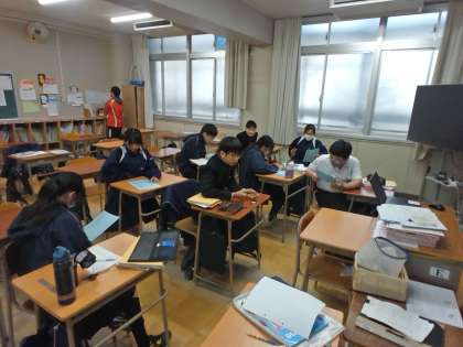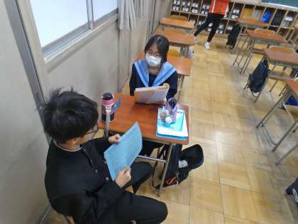 新しく学習した英単語や英語表現の意味や発音をペアワークで確認し合っています。
