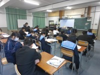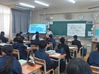1年生では、キャリア教育の一環で、地元浪速区にあるNPO法人のシューネクストさんに来校していただき、地場産業でもある「皮革産業」についての職業講話を聞いています。昨日の1組に続いて、今日(1月22日)は2組が取り組みます。