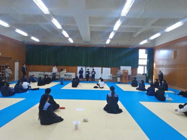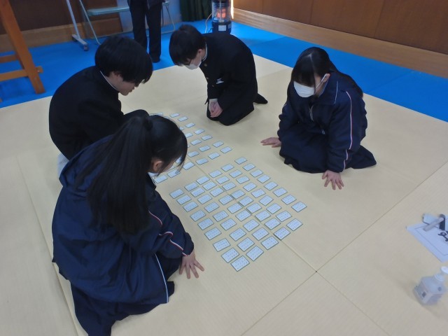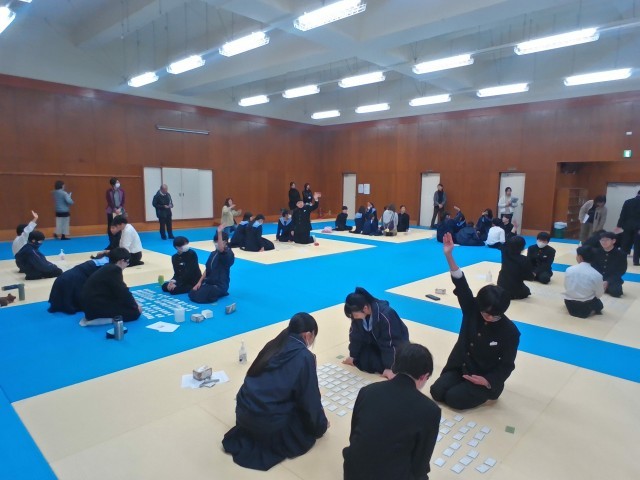 5時間目と6時間目を使って、格技室にて1年生の「百人一首大会」が行われています。