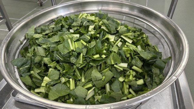 今日はこまつなのごまあえです。旬を迎えて甘味が強くなっているこまつなをゆで、ごまだれで和えました。