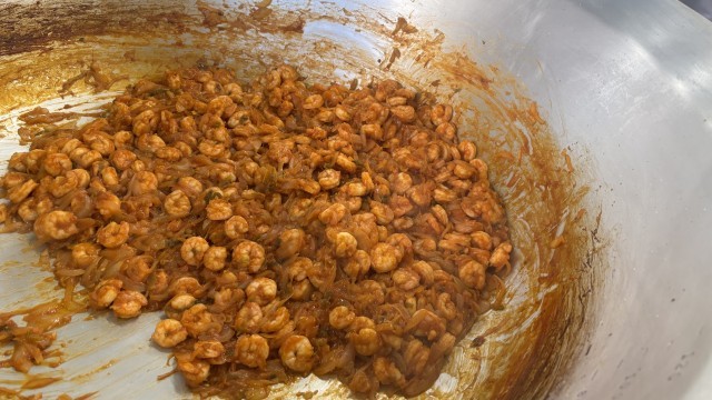 今日はえびのチリソースいためです。大ぶりのえびをゆで、ケチャップベースの甘辛いタレであえました。