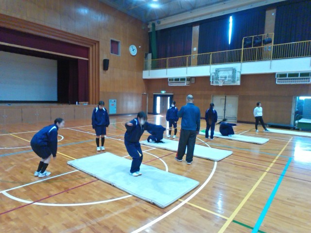 体育館でマット運動に取り組んでいます。