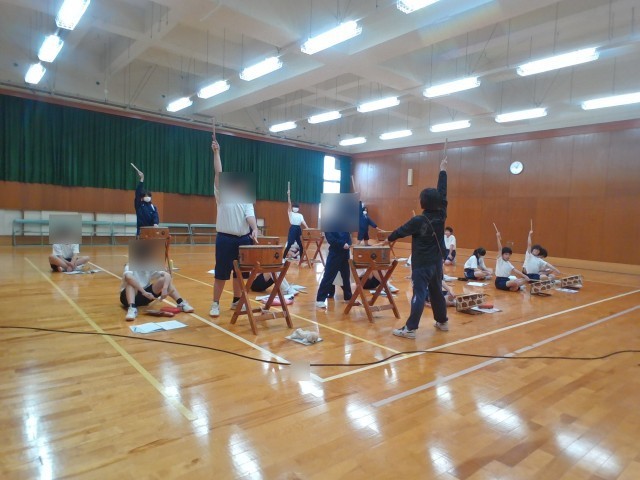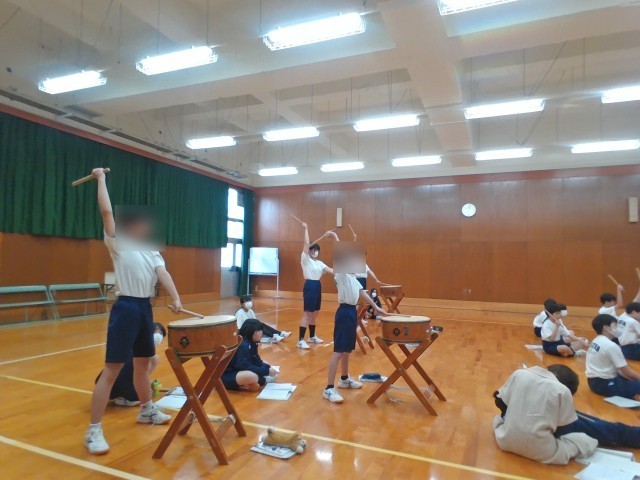 音楽の授業では、和太鼓を使った学習を行っています。基礎的な打ち方の練習の後、2種類の音符を見ながらリズムに合わせて太鼓をたたく活動に取り組みました。リズムの面白さや表現する楽しさを感じている様子が見られました。