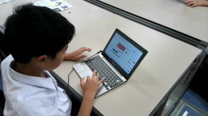 それぞれが学習者端末でデザインした図柄を「うちわ」にしていく作業にとりかかっています。 -