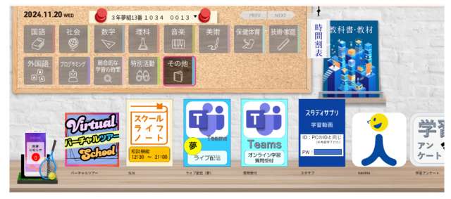 1時間目から4時間目の間、国語、社会、数学、理科、英語の授業はライブ配信をして、自宅からでも授業を受けることができるようにしています。ここでは、どのような感じで行っているのか、学習者用端末の操作感を紹介します。