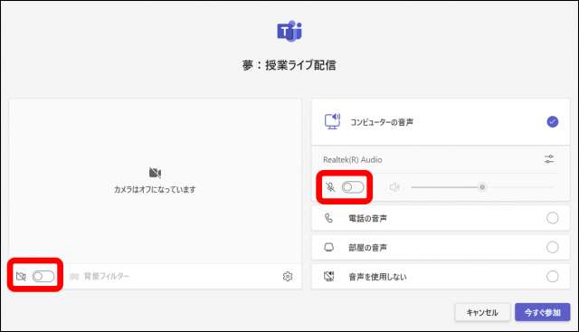 カメラもマイクもOFFにして、オンライン会議に参加します。