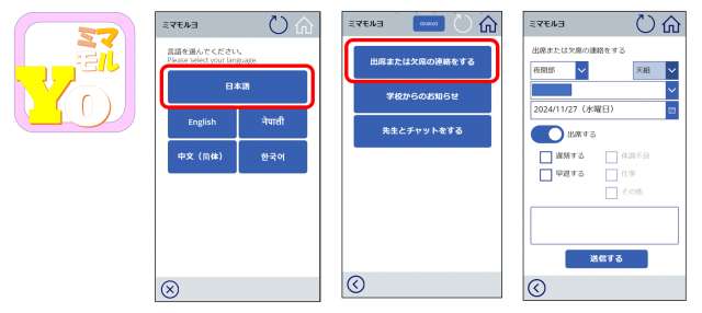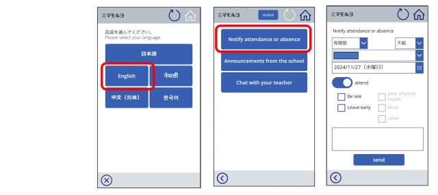 「ミマモルメ」と同じように、出席(遅刻・早退)や欠席の連絡が可能です。