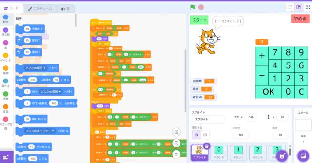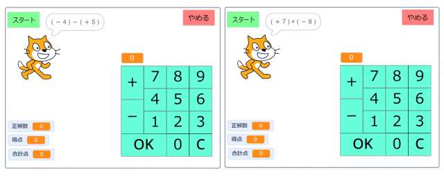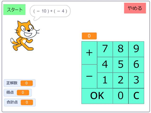 スクラッチでおなじみのスクラッチキャットが問題を出し、数字や符号のボタンを押して回答していきます。