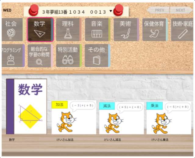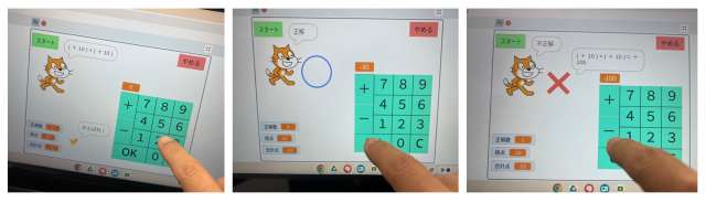 ビジュアルプログラミングの「Scratch」で、正負の数の計算練習ができるゲームを作成し、ちょっとした時間に取り組めるようにしています。