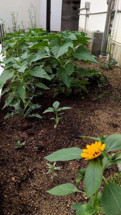 玄関の植え込みスペースでひまわりが1輪、ひっそりと咲きました。